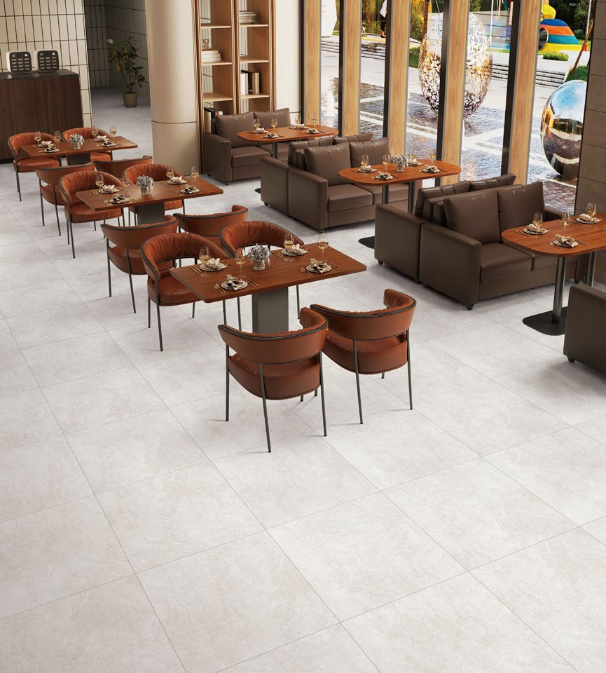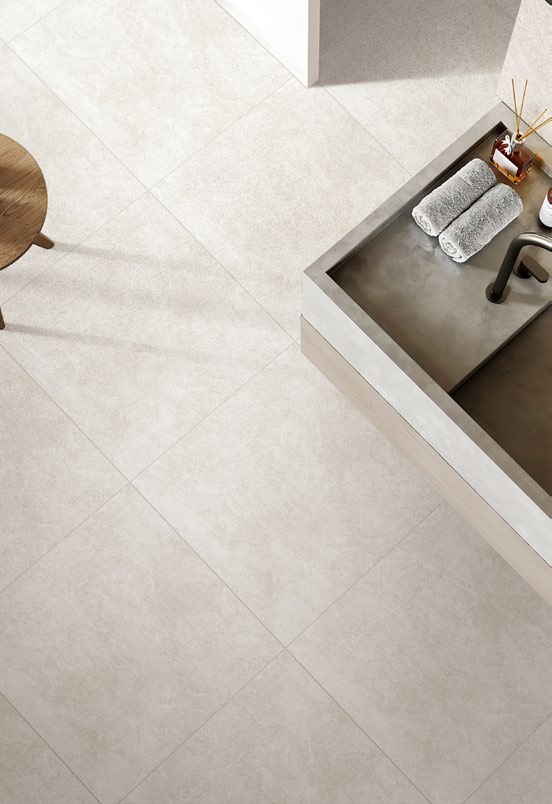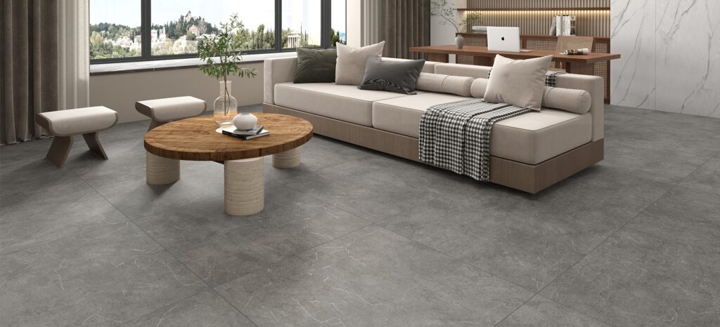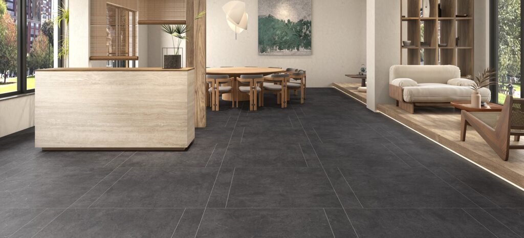 900角の大判タイルがダイナミックで落ち着いた空間を演出します。